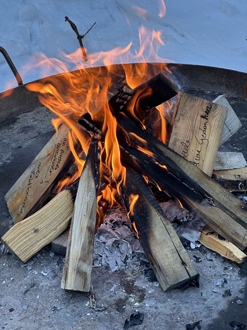 Nach dieser äußerst interessanten Yogasession machen wir uns auf den Rückweg und genießen die Geräuschkulisse der Natur. Ein besonderes Highlight steht zum Abschluss der Tour noch bevor: Mit viel Einsatz (und auch etwas Glück) entfachen wir in einer Feuerschale ein kleines Feuer, stehen als Gruppe versammelt davor und genießen eine heiße Tasse Tee. Während wir den Feuerzungen bei ihrem Tanz zusehen, teilt Katharina, eine unserer Guides, kleine Holzscheite aus, auf die wir schreiben sollen, was wir gerne loslassen möchten. Jeder nimmt sich kurz Zeit, um seine Sorgen niederzuschreiben und diese anschließend in Form der Holzscheite den Flammen zu übergeben. Dem Feuer zuzusehen hat etwas Meditatives und fast schon ehrfürchtig stehen wir davor, wärmen uns und gehen jeder für sich seinen Gedanken nach. Ein schöner Abschluss für eine ganz besondere Schneeschuhwanderung.